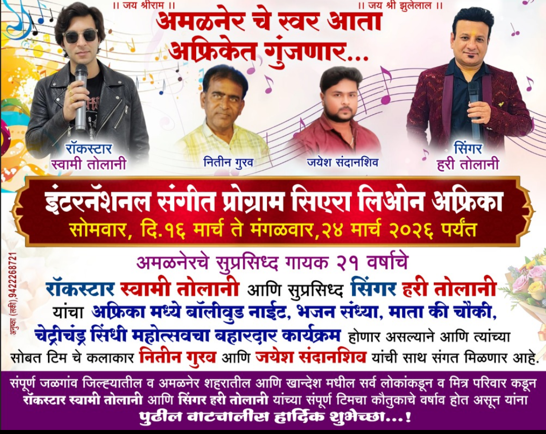 View Allअमळनेरच्या सुरांचा आफ्रिकेत डंका! रॉकस्टार स्वामी तोलानी अन् हरी तोलानी यांची सिएरा लिओनमध्ये ‘बॉलिवूड नाईट’
