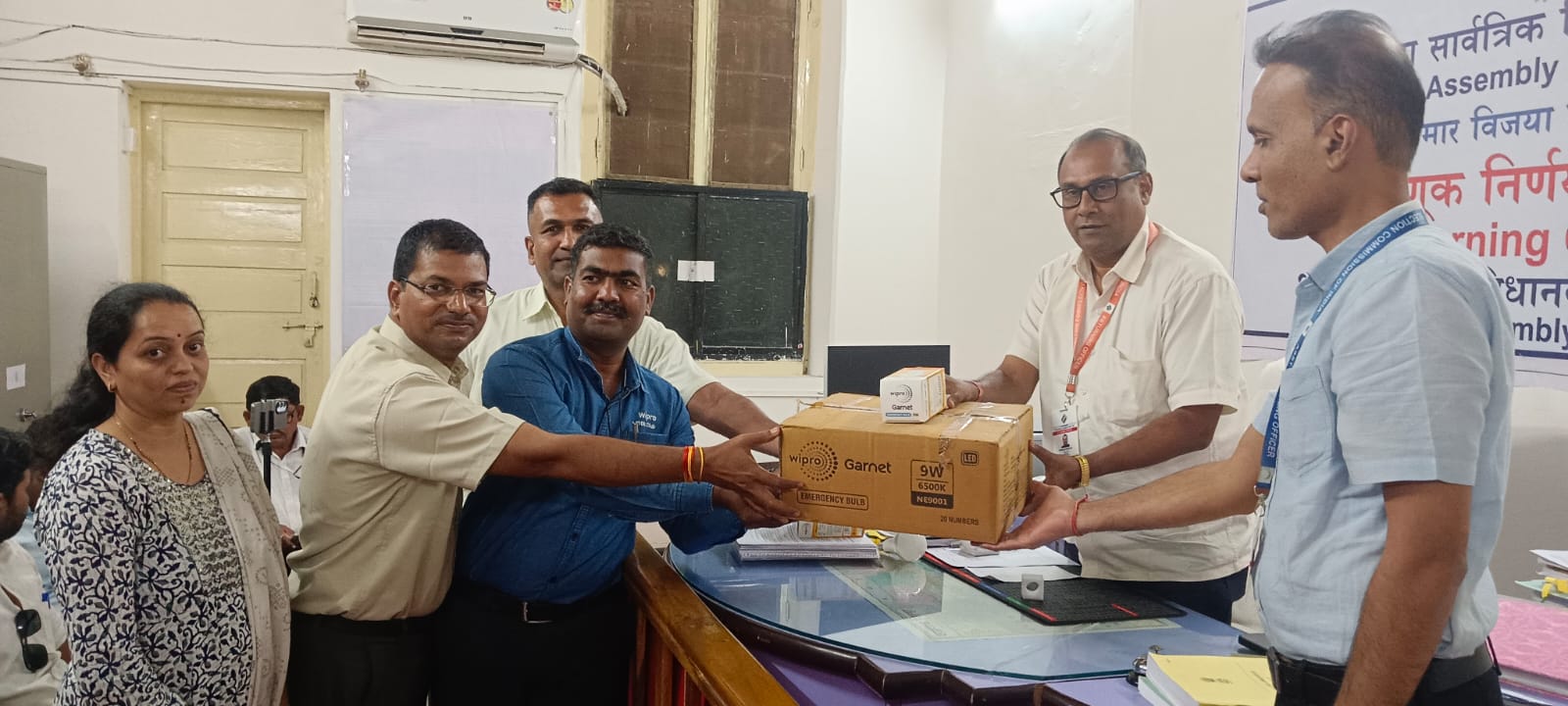 पुरवठा करण्यात आला.दिनांक 18 रोजी दुपारी साडेतीन वाजता अमळनेर तहसील कार्यालयामध्ये विप्रो केअर कंपनी चे अधिकारी व आधार संस्थेचे प्रतिनिधी यांच्यामार्फत माननीय निवडणूक निर्णय अधिकारी नितीन मुंडावरे, तहसीलदार रुपेश कुमार सुराणा यांच्या उपस्थितीत इलेक्ट्रिक चार्जिंग बल्ब मतदान केंद्रावर पुरेशा प्रकाश रहावा उद्देशाने बल्ब सुपूर्द करण्यात आले व लोकशाहीच्या सगळ्यात मोठ्या उत्साहात सहभाग घेण्याचे ठरवले