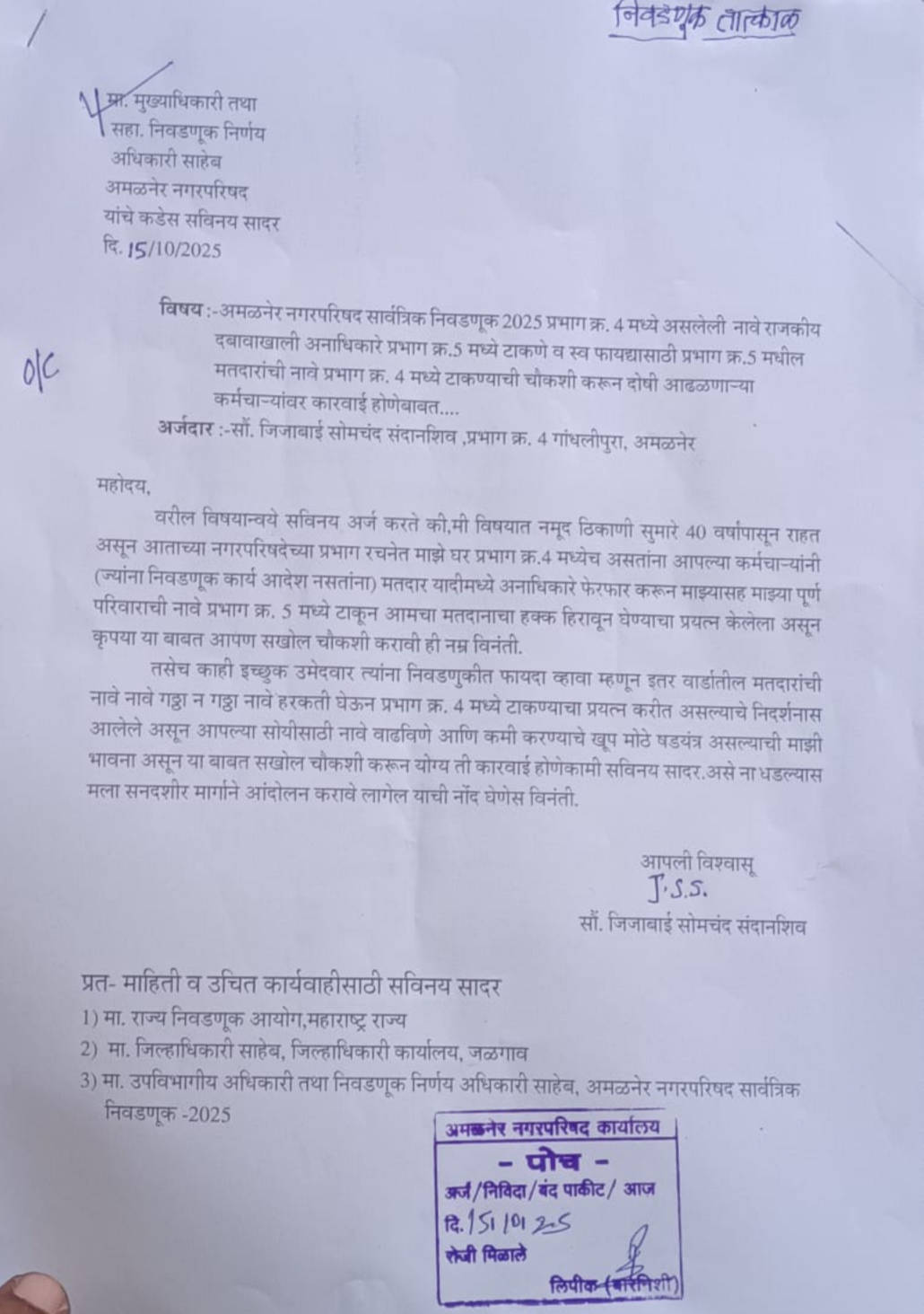 सविस्तर वृत्त की, शहरातील सिद्धार्थ चौक,गांधलीपुरा डॉ. आंबेडकर बोर्डा जवळ राहणारे सोमचंद छगन संदानशिव हें तेथील रहिवासी असून त्यांनी येणाऱ्या नगरपरिषदेच्या निवडणुकीत प्रभाग क्रं 4 मध्ये अनुसूचित जाती साठी राखीव जागेवर आपल्या धर्मपत्नी यांना रिंगणात उतरविण्याचे जाहीर केले आहे .मात्र अमळनेर नगरपरिषद सार्वत्रिक निवडणूक २०२५ च्या प्रभाग निहाय मतदार याद्या बनविण्याचे काम त्या त्या वार्डातील कर्मचाऱ्याकडे दिलेले होते. परंतु सदर कामी आदेशात नमूद कर्मचाऱ्यांच्या व्यतिरिक्त इतर न पा कर्मचाऱ्यांनी बेकायदेशीर रीत्या प्रभाग क्र.४ च्या यादीच्या कामकाजात हस्तक्षेप करून माझे व माझ्या पूर्ण परिवाराचे नाव प्रभाग क्र.४ मधून प्रभाग क्र.५ मध्ये टाकून माझी नावे प्रभाग ४ मधून वगळल्याची तक्रार करीत संबंधित कर्मचाऱ्यावर कायदेशीर कारवाई करून त्या कालावधीतील सी.सी.टी व्ही फुटेज मिळणे कामी सोमचंद संदानशिव यांनी मुख्याधिकारी तथा सहाय्यक निवडणूक निर्णय अधिकारी अमळनेर नगरपरिषद सार्वत्रिक निवडणूक २०२५ यांचे कडे तक्रार दाखल केल्याने शहरात उलट सुलट चर्चेला उधान आले आहे.